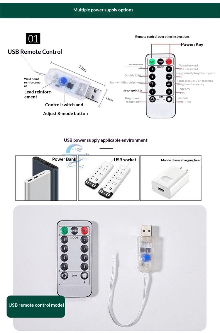 Specifications: USB remote control (eight functions), solar remote control (800mAh), low-voltage plug-in (US or EU standard)