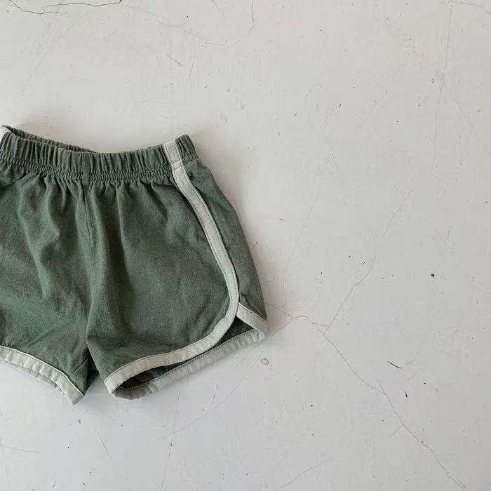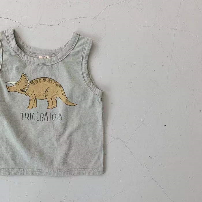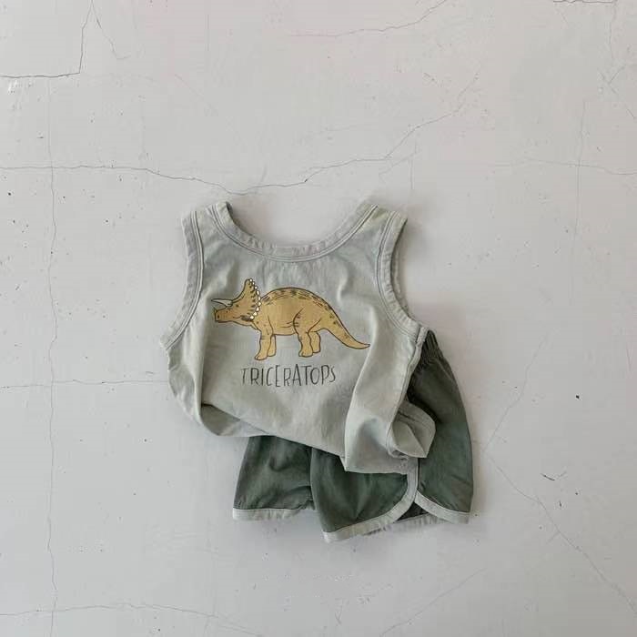 Light blue dinosaur TRICERATOPS vest + dark green shorts,