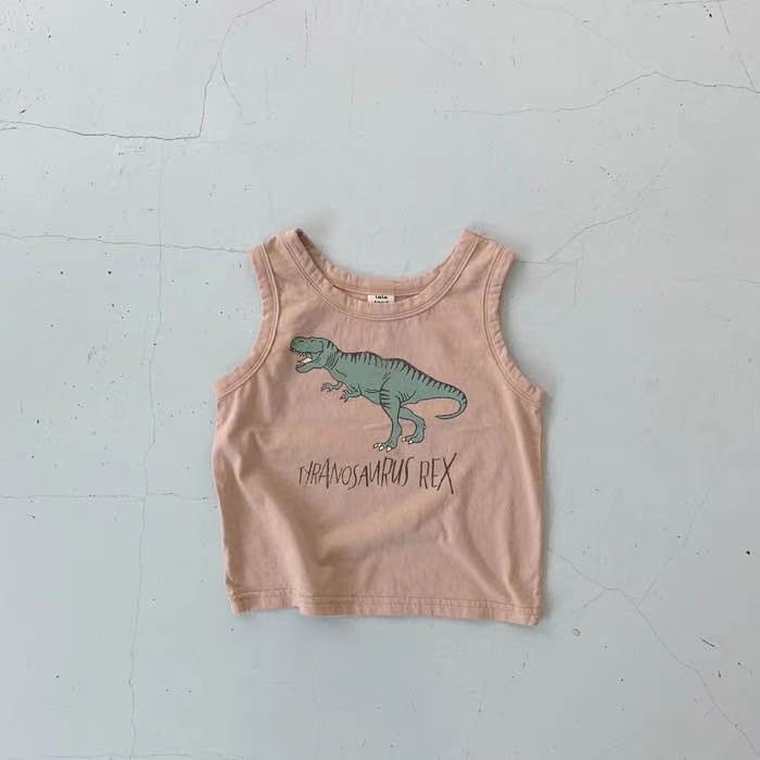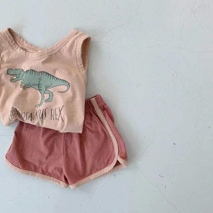 Pink dinosaur TYRANOSAURUS vest + cinnabar red shorts