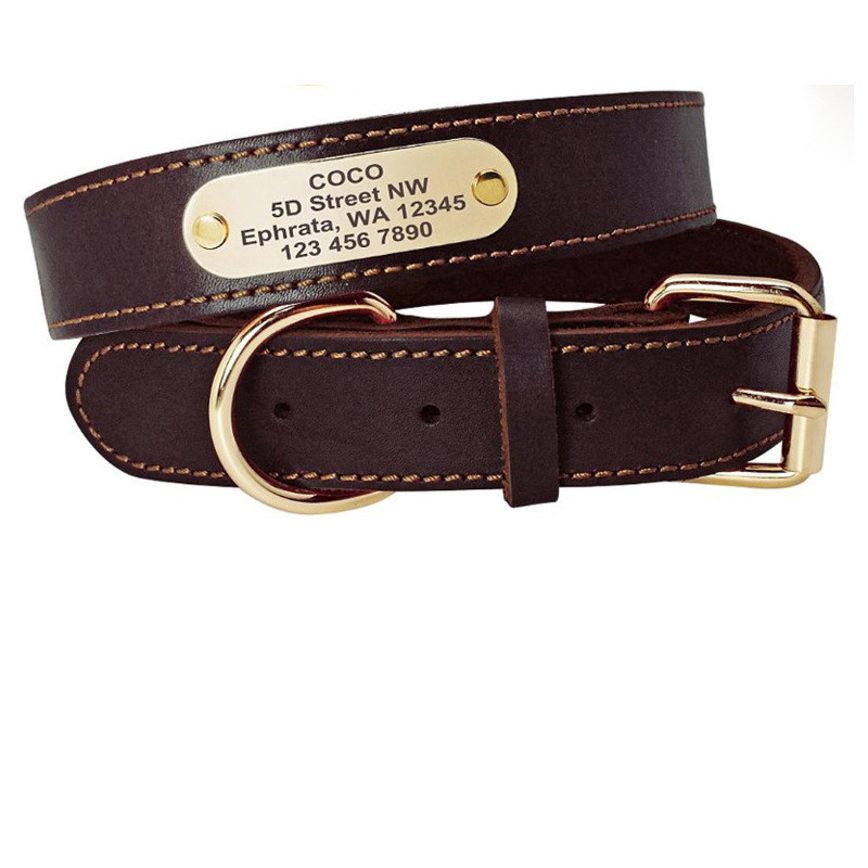 Personalized dog collar with golden nameplate - Custom laser engraved with pet's name, phone number and address.