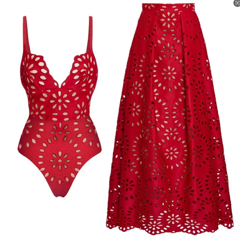Color: Black one-piece, black dress, black suit, dark blue one-piece, dark blue skirt, dark blue suit, red one-piece, red dress, red suit skirt