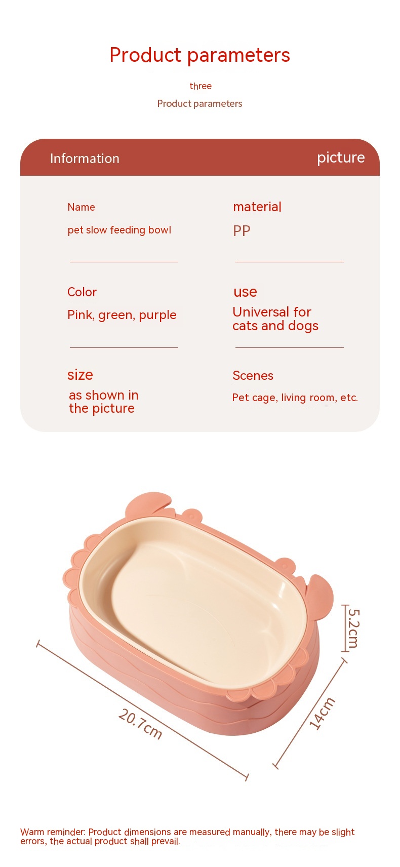 Product information:Color: gray, pink, green Material: pp Applicable object: Cat Category: Pet tableware