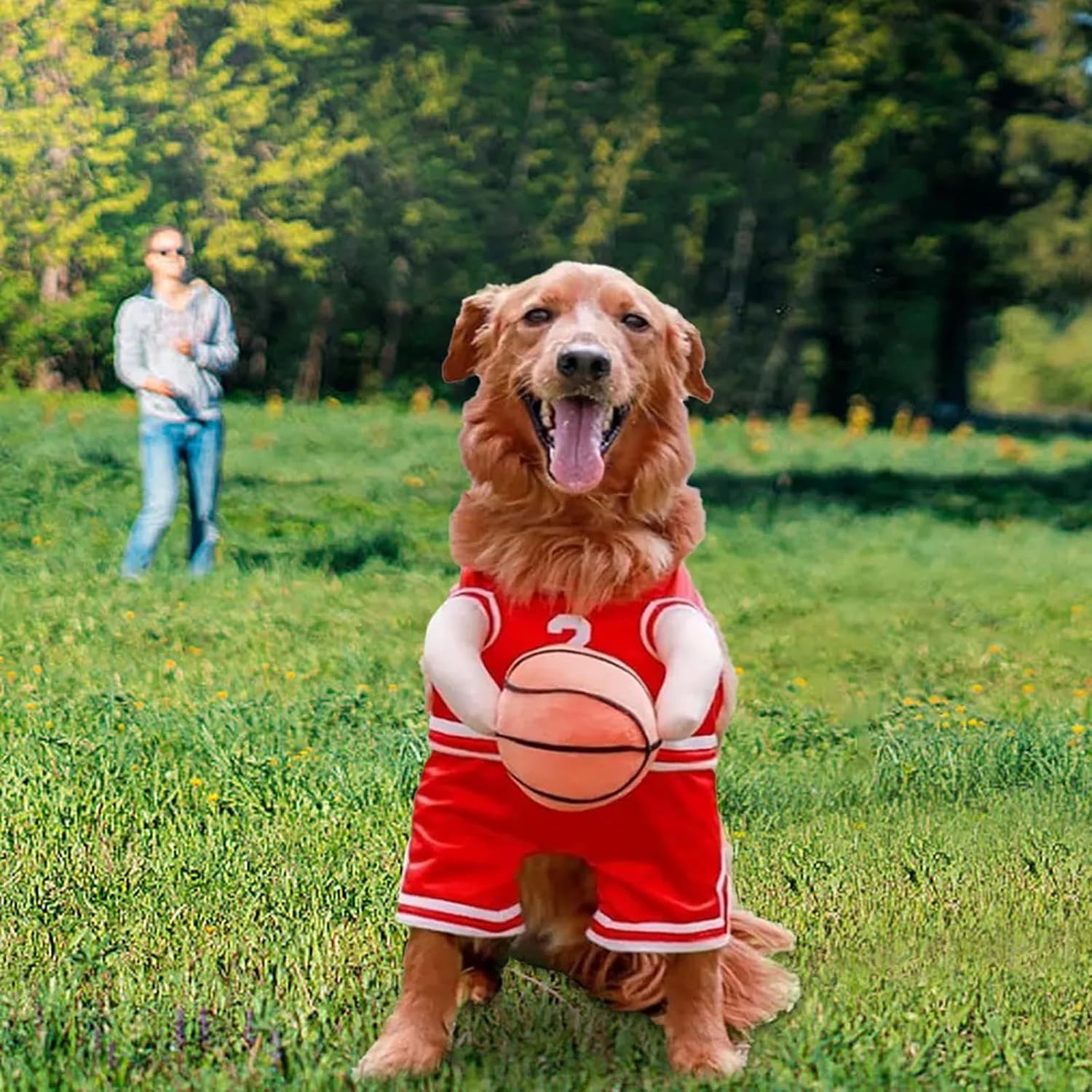 Interesting design: Dog basketball player clothing makes your pet look like a basketball player.It has padded arms that make it look more realistic, and a basketball that looks fun bouncing when your pet runs around