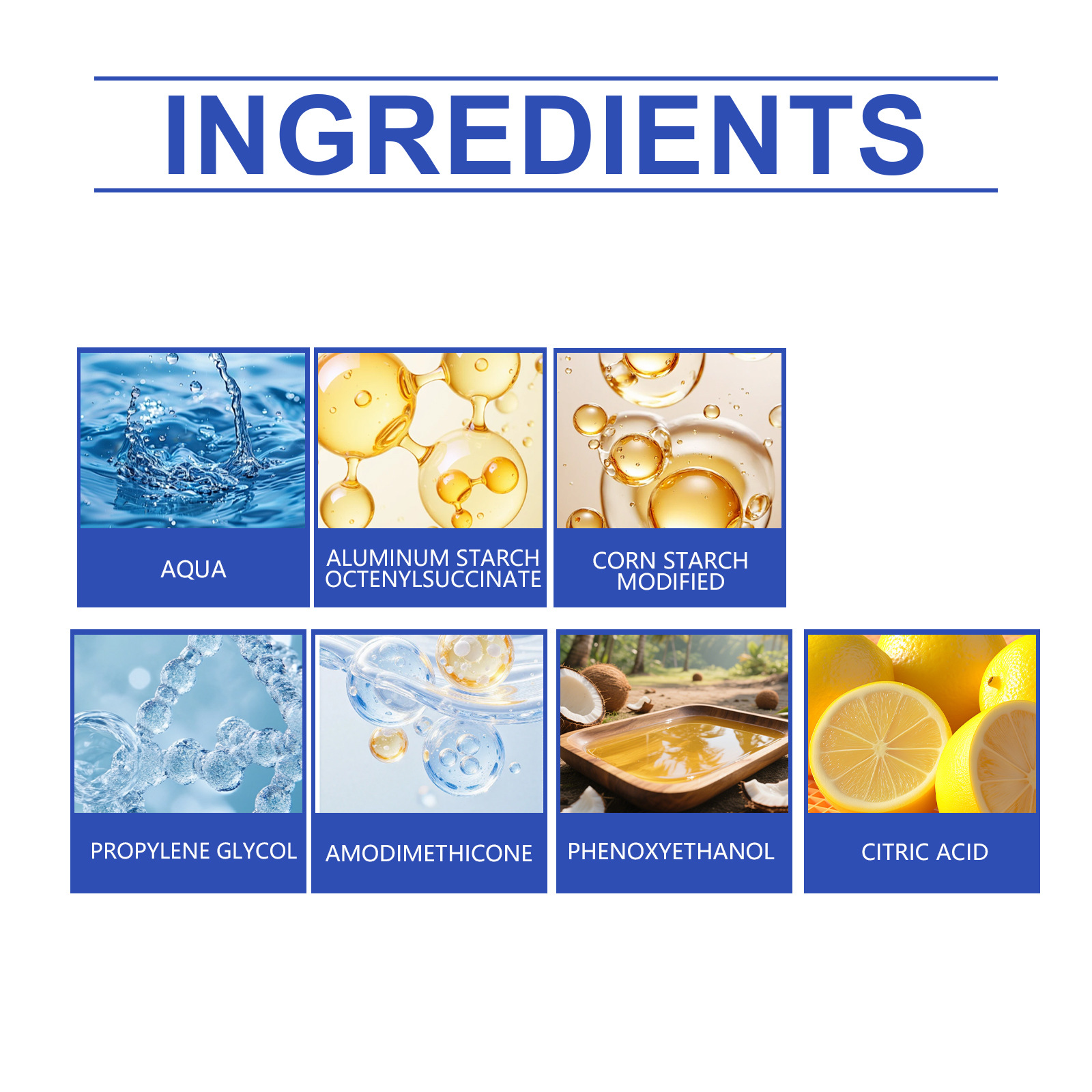 Ingredients: water, starch octenyl aluminum succinate, modified corn starch, propylene glycol, ammonia-terminated polydimethylsiloxane, phenoxyethanol, citric acid.