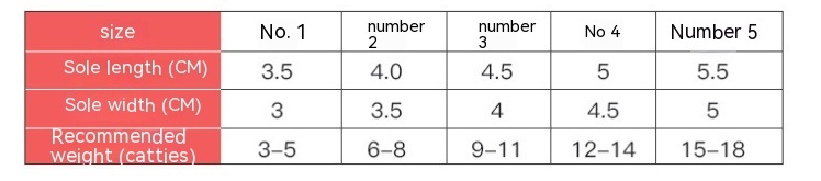 Size: No. 1 length 3.5 width 3cm 1.50kg-2.50kg,No. 2 length 4.0 width 3.5cm 3.00kg-4.00kg,No. 3 Length 4.5 width 4.0cm 4.50kg-5.50kg,No. 4 length 5 width 4.5cm 6.00kg-7.00kg,No. 5 Length 5.5 width 5cm 7.50 kg-9.00kg