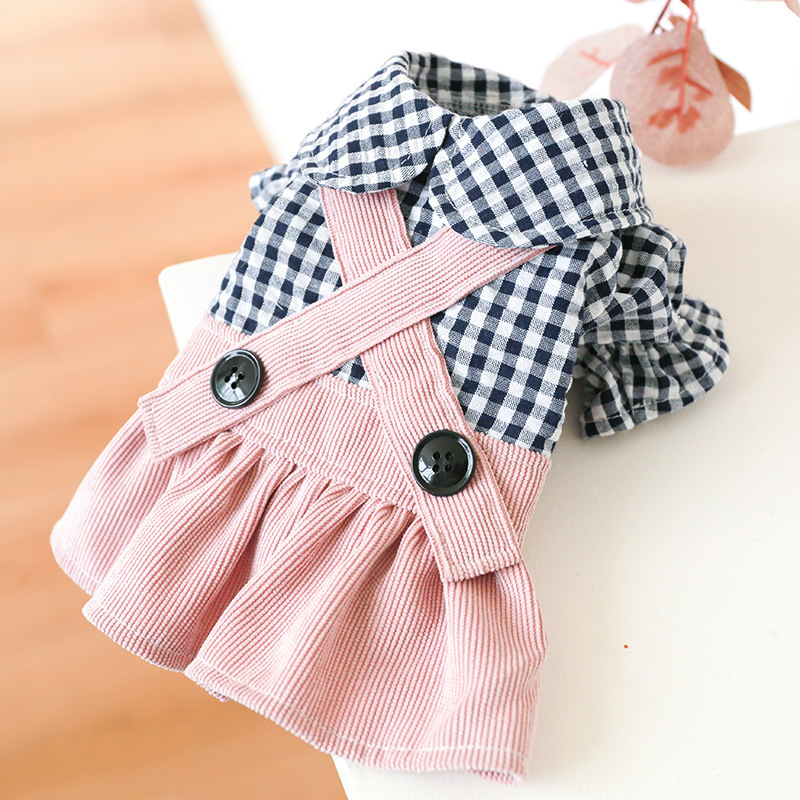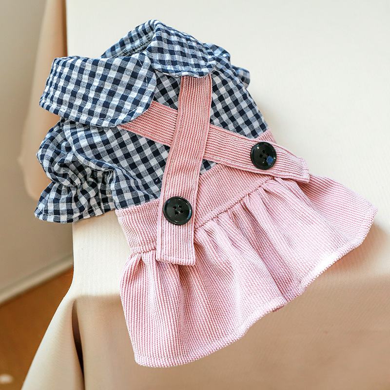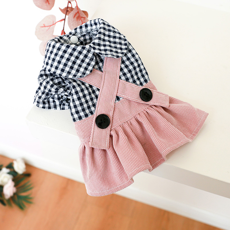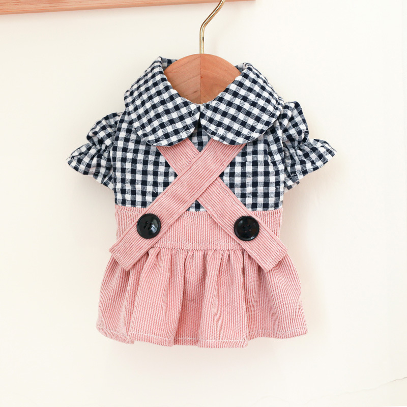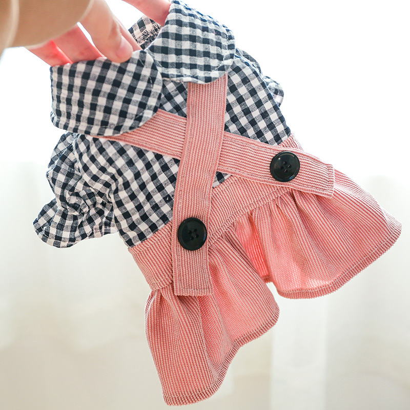 Color: Black Button Plaid overall dress, blue and white bow suspenders dress