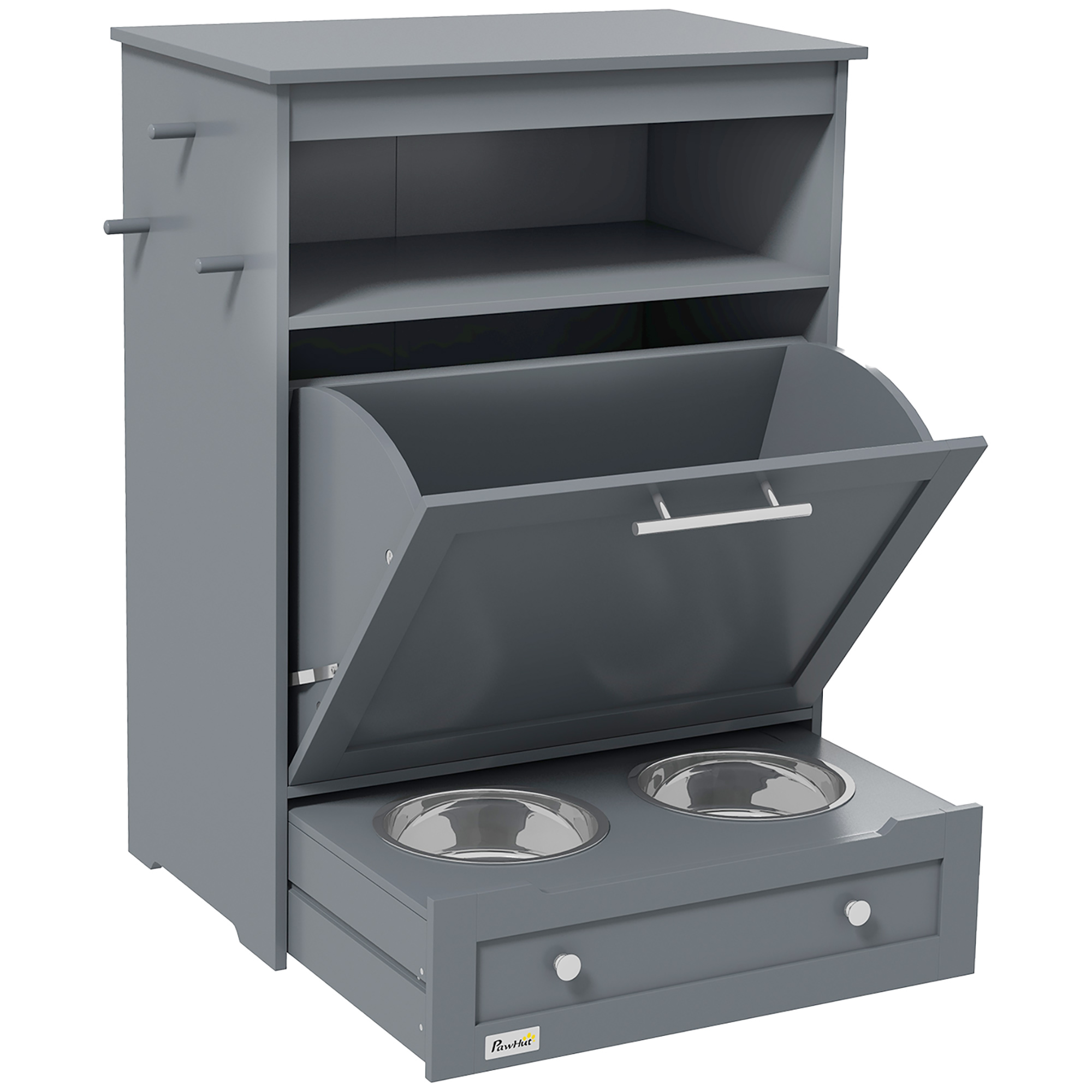 PawHut Pet Feeder Station, Locker Dog Food Storage Container, with Raised Dog Bowl and Hook for Feeding and Watering Supplies, Grey