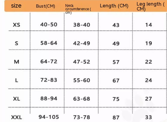 Size: XS (chest circumference 40-50cm body length 43cm recommended 7.50kg-12.50kg,S (chest circumference 58-64cm body length 49cm recommended 12.50kg-17.50kg,M (chest circumference 64-72cm body length 57cm recommended 17.50kg-22.50kg,L (chest circumference 72-83cm body length 67cm recommended 25.00kg-30.00kg,XL (chest circumference 88-94cm body length 75cm recommended 32.50kg-37.50kg,XXL (chest circumference 94-105cm body length 87cm recommended 37.50 kg-45.00kg