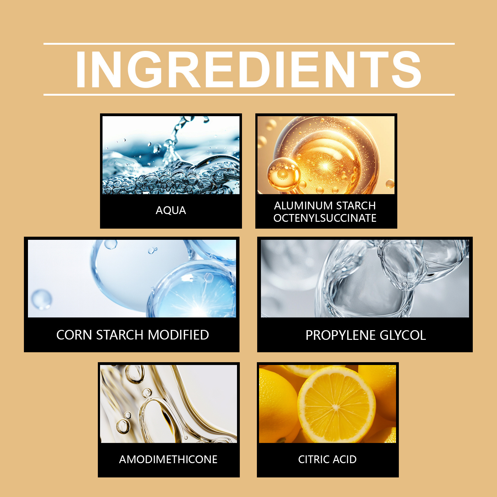 Ingredients: water, starch octenyl aluminum succinate, modified corn starch, propylene glycol, ammonia-terminated polydimethylsiloxane, phenoxyethanol, citric acid.