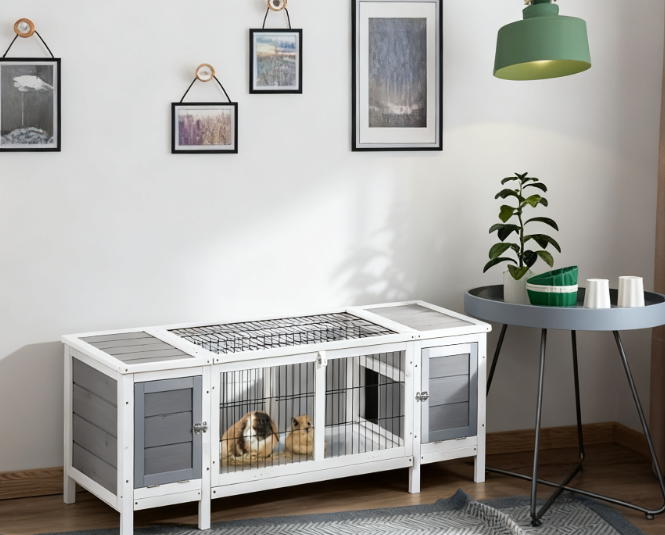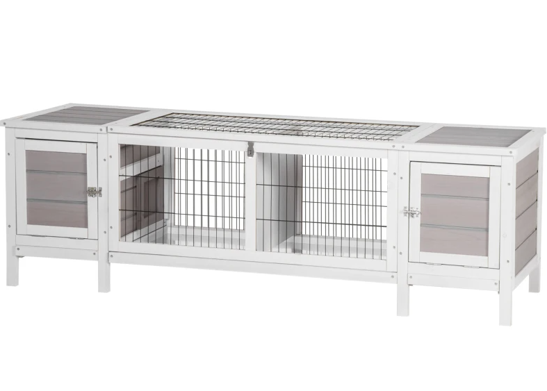 Features: - Multifunctional use, an extractable divider in the middle and two sides that can be used together or separately - The top of the running cage opens with a tray for easy cleaning. - Indoor use, concise deco makes it can be displayed in your home anywhere you like. - Assembly required Specification: - Color: White, Gray - Material: Fir Wood, Steel - Overall Size: 63.5" W x 20" D x 21" H - The Main Nest Size: 13.5" W x 19.25" D x 15.75" H - Door Size: 10.75" W x 12" H - Whole Middle Hutch Size: 36.6" W x 19.3" D x 15.7" H - Doorway Size: 7.75" W x 7.25" H - Bowl Size: Dia 4.25" x 1.25" H - Tray Size: 36.5" W x 18.5" H - Frame Size: 1.25"W x 0.75"T Package Includes: - 1 x Rabbit Hutch - 1 x Manual