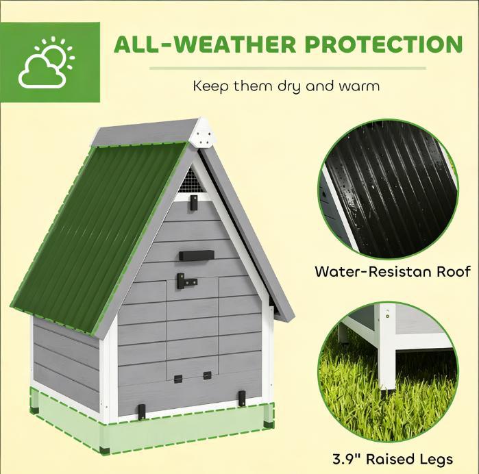 • - All-Weather Protection: Made with stable fir wood, a water-resistant roof, and a 3.9" elevated base, this chicken coop protects your hens from rain, sun, and snow, keeping them safe, dry, and comfortable year-round