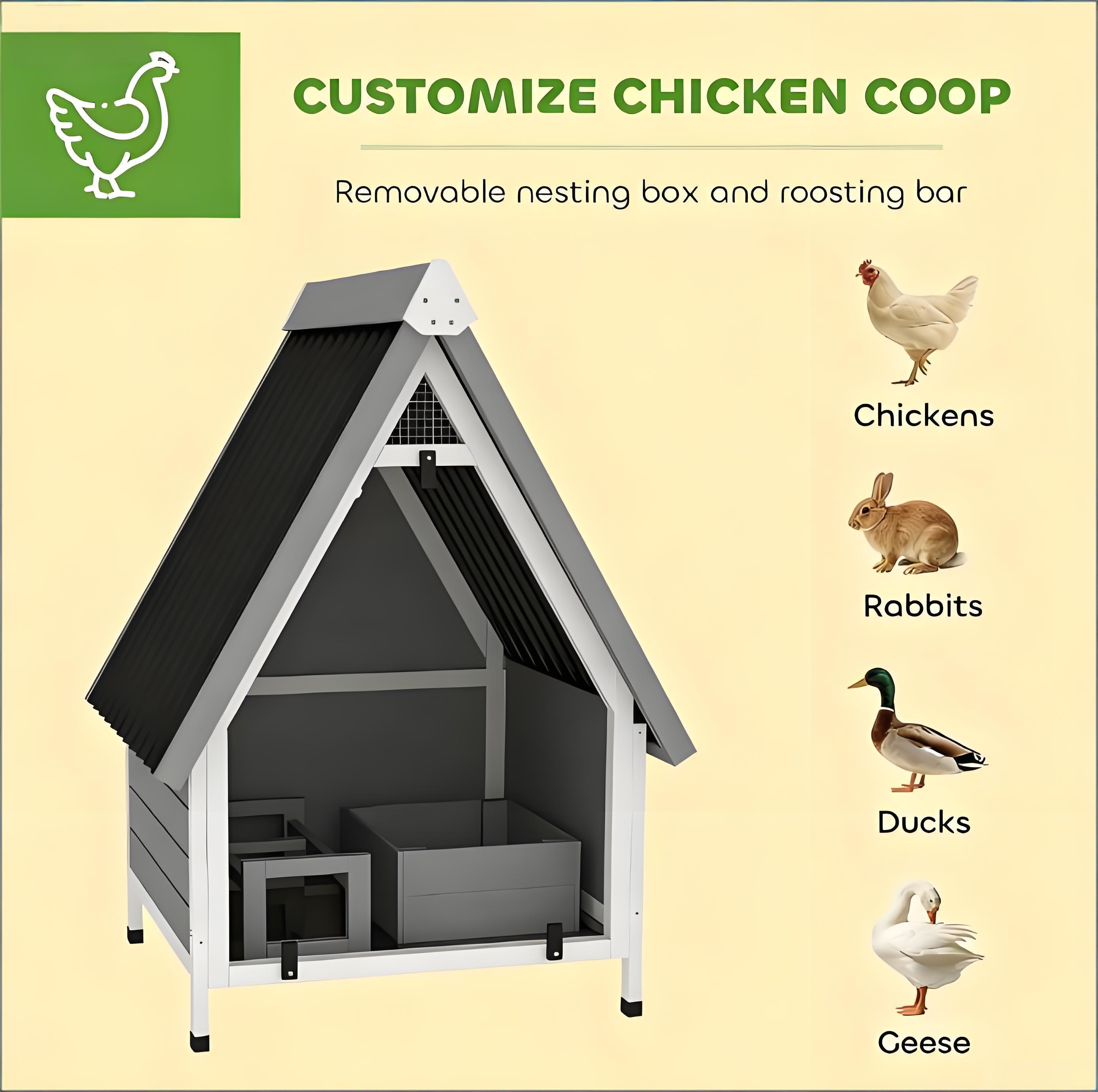 • - Customizable Interior: The movable roosting bar and nesting box let you adjust the chicken house easily, adapting the indoor space for chickens, ducks, geese, or rabbits across different routines and changing needs