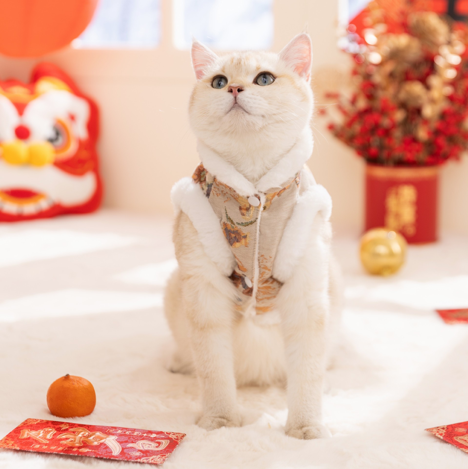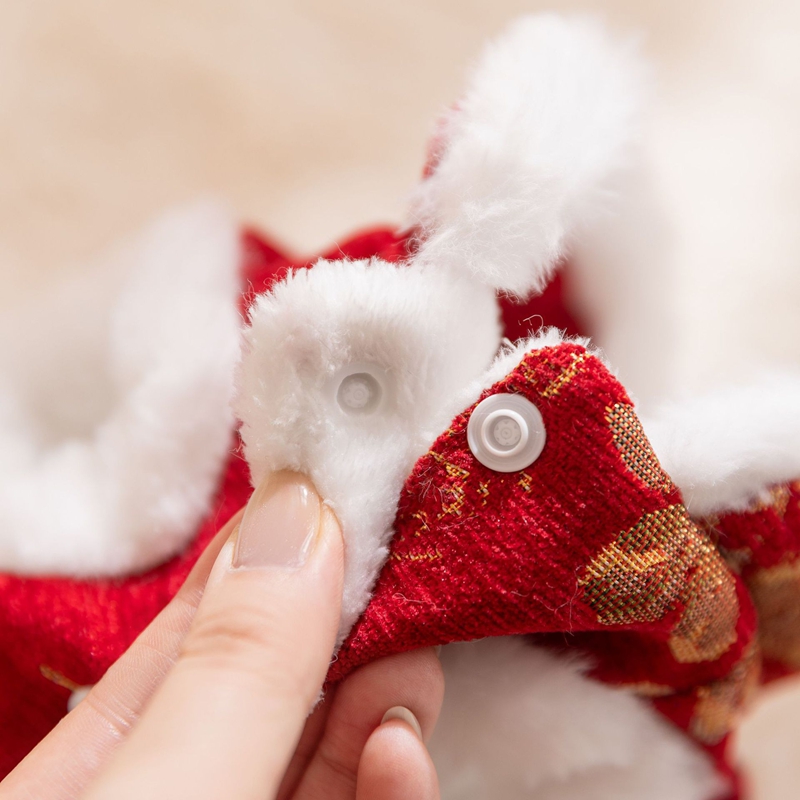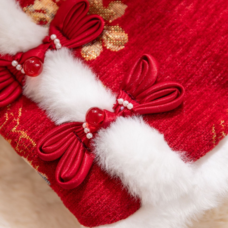 - Authentic Chinese design: Featuring the classic frog knot (a traditional knot) and festive patterned brocade fabric (red/gold representing good luck, or soft beige with floral patterns), decorated with fluffy white artificial fur, luxurious and warm.