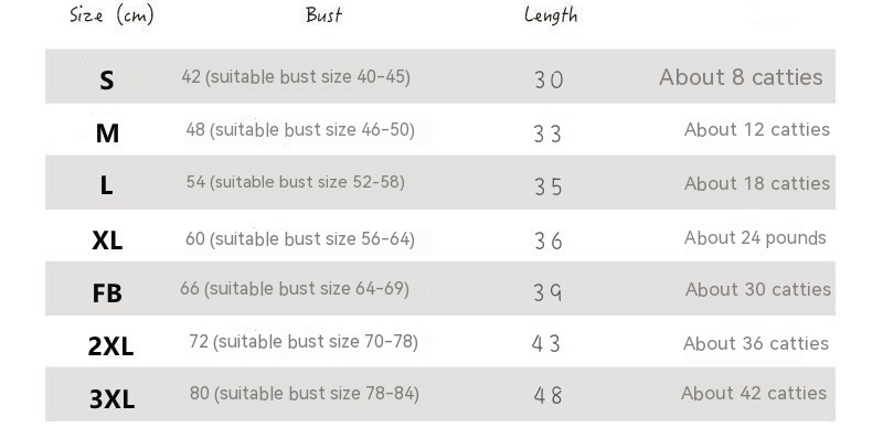 Size: S bust 42 length 30 (about recommend),M bust 48 length 33 (about recommend 12),L bust 54 length 35 (about recommend 18),XL chest circumference 60 length 36 (about recommend 24 Jin),FB chest circumference 66 length 40 (about recommend 30 Jin)
