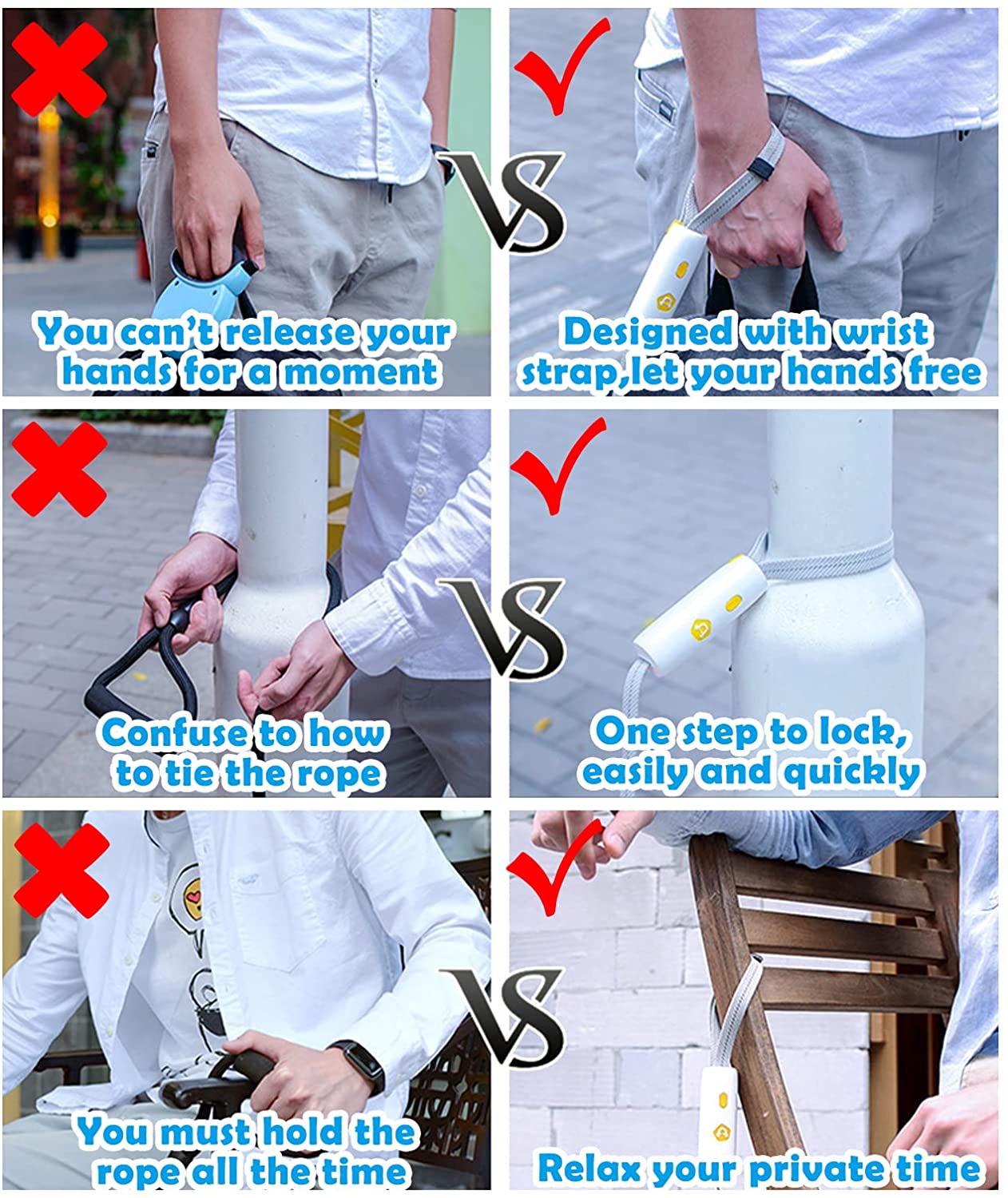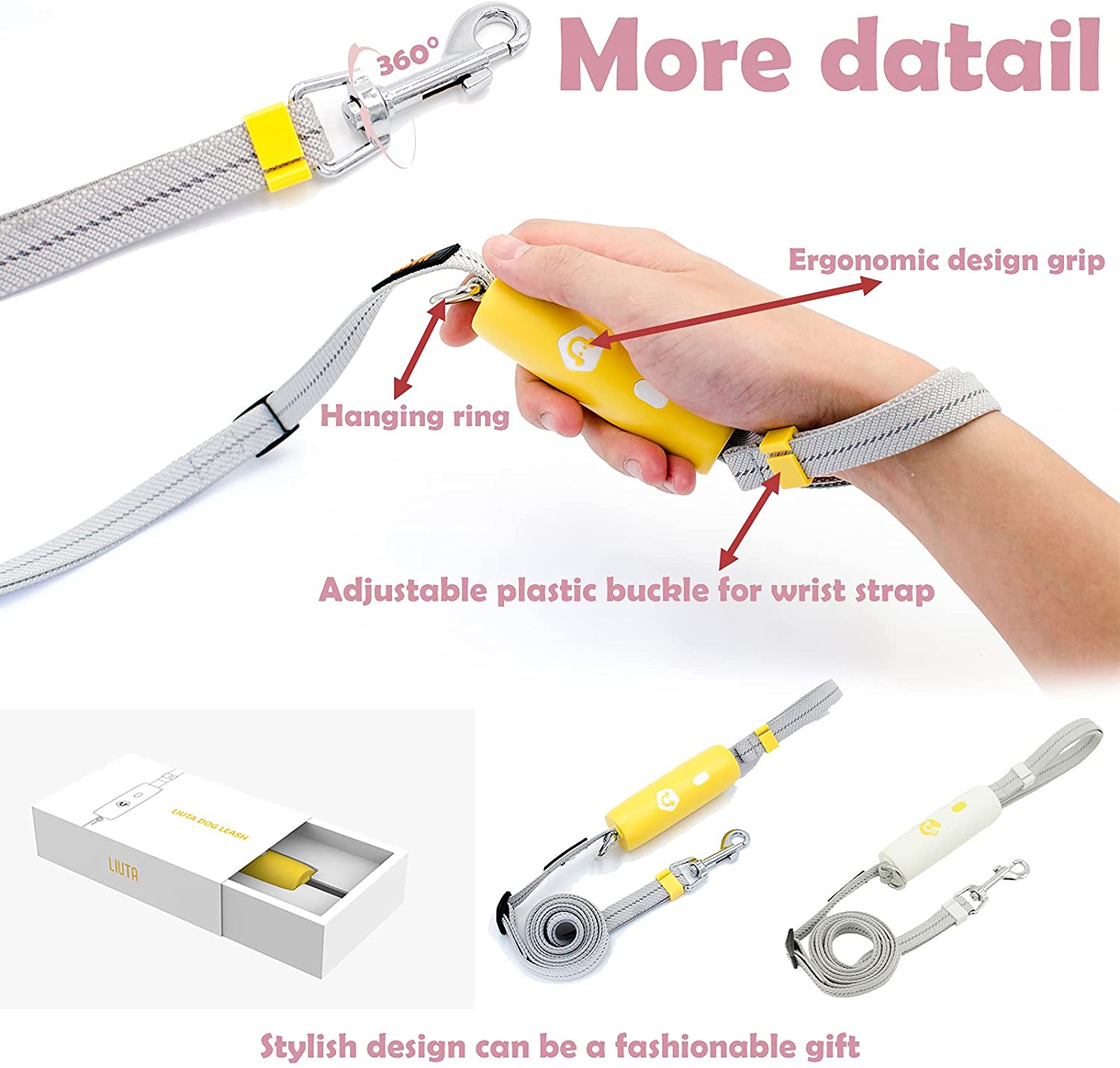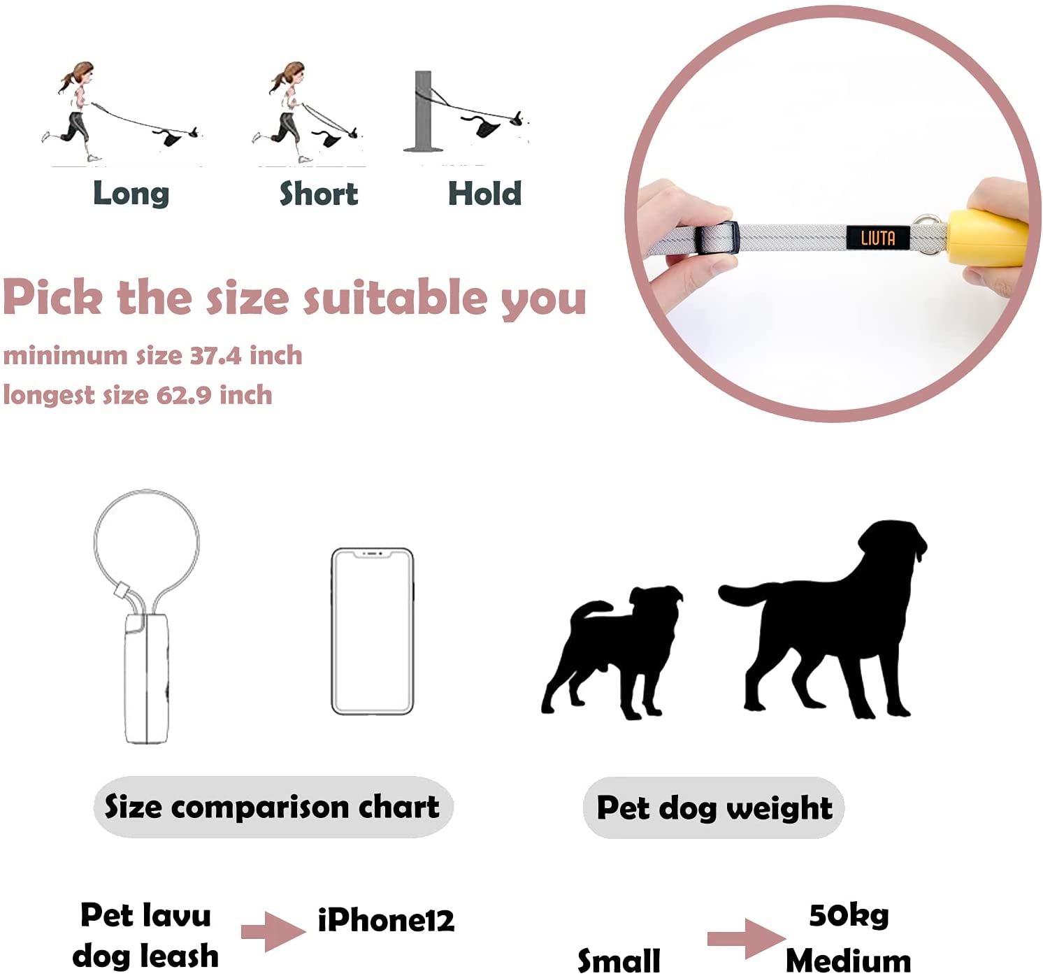 1. Hands Free Dog leash:Press one button to lock and unlock .If you need, you just tie it on your wrist or shoulder quickly.LIUTA Pet leash