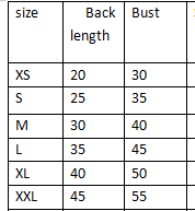 XS (suitable for 2-3 pounds), S (suitable for 3-5 pounds), M (suitable for 5-7 pounds), L (suitable for 7-9 pounds), XL (suitable for 9-11 pounds), 2XL (suitable for 12- 15 kg)