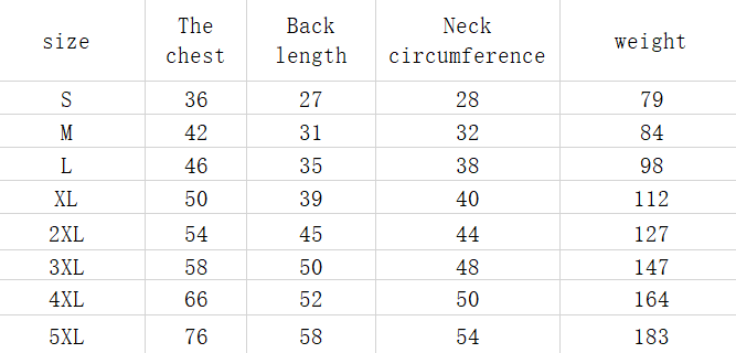 Size: s suggestion (within 5 jin), m suggestion (5-8 Jin), l suggestion (8-11 Jin), XL suggestion (11-14 Jin), XXL suggestion (14-20 Jin), 3XL suggestion (20-27 Jin), 4XL suggestion (27-40 Jin), 5XL suggestion (40-60 Jin)