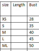 XS back length 20cm (recommended 2 kg), S back length 25 (recommended 3-4 kg), M back length 30 (recommended 5-7 kg), L back length 35 (recommended 8-10 kg), XL back Length 40 recommended 11-15 kg