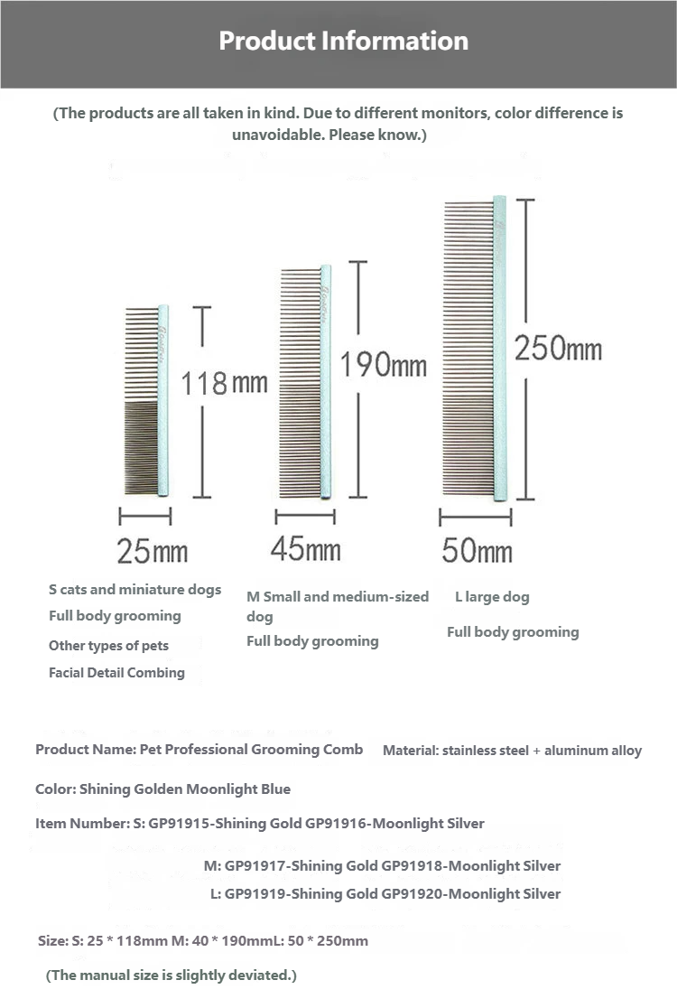Medium (M): 40×190mm, suitable for medium-sized dogs' full-body combing.