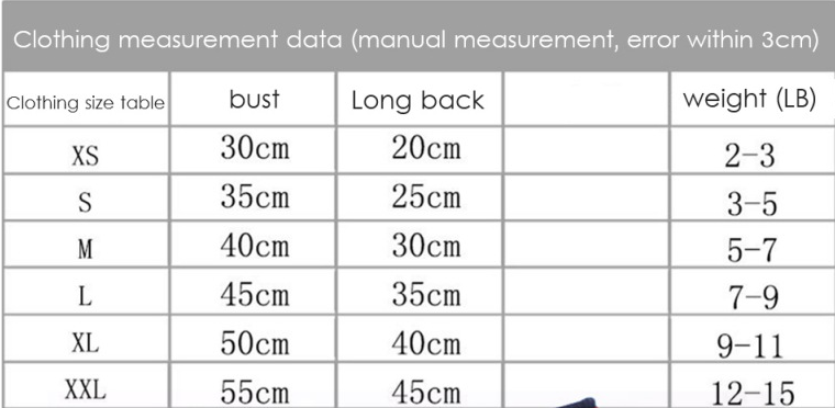 Size: XS back length 20cm, S back length 25cm, M back length 30cm, L back length 35cm, XL back length 40cm, XXL back length 45cm