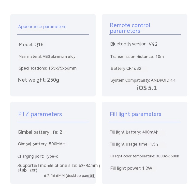 Main material: ABS+aluminum alloySpecification: 155x75x66 mmPan tilt endurance: 2 hoursPan tilt battery: 500mAhCharging port: Type-CSupported phone size: 43-84mm (stabilizer) 6.7-16.6mm (desktop pan tilt)
