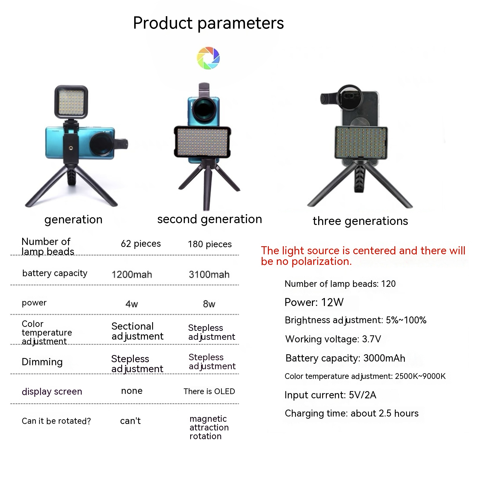 Color classification: First Generation small light (62 lamp beads), second generation headlight (180 lamp beads), third generation tattoo photography artifact (120 lamp beads)