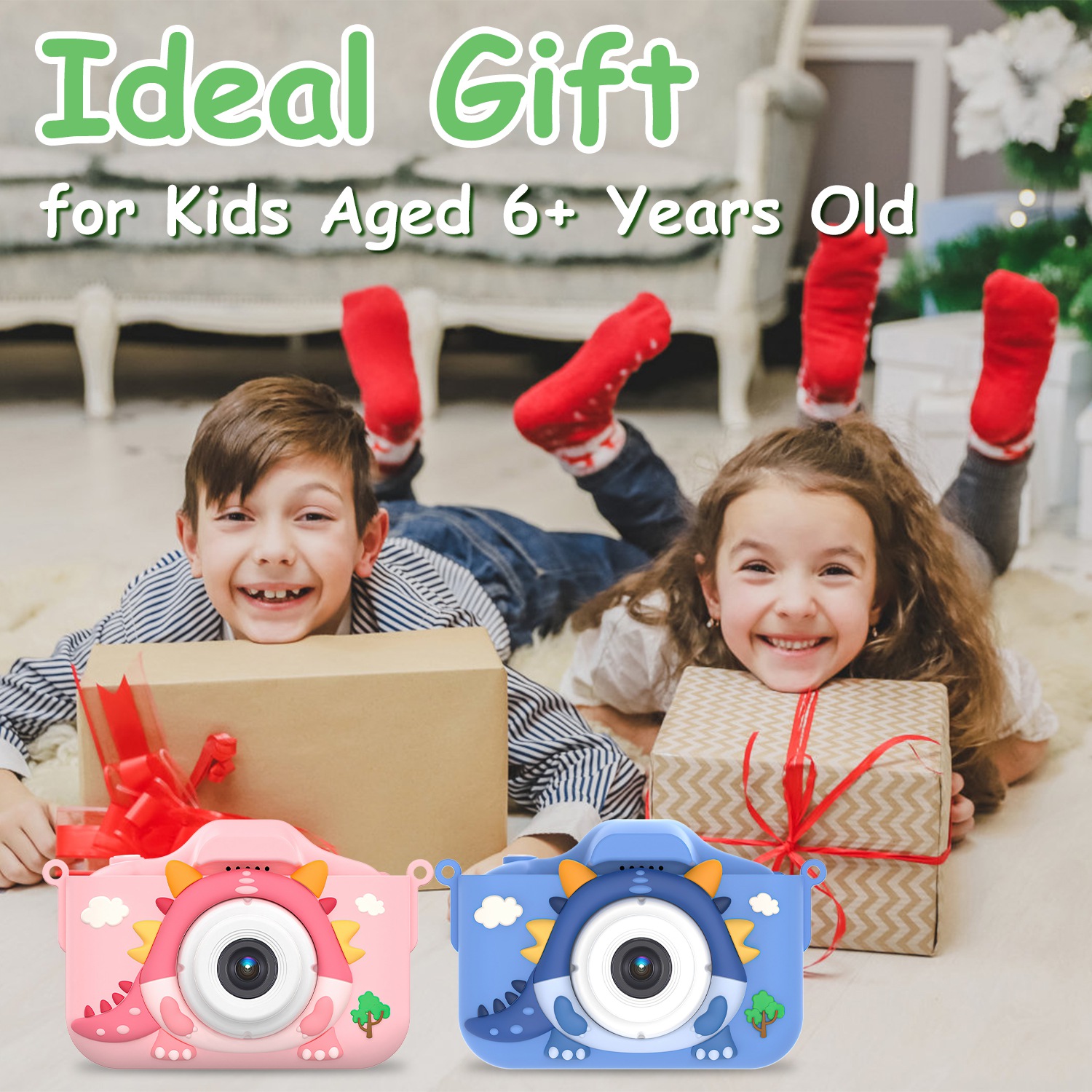 • *Ideal Gift*:This kids camera equips with dual lens,allowing your lovely little ones to take selfie or record happy & memorable moment anytime anywhere. Come with a cute dinosaur cartoon case and a lanyard,a beautiful gift that cannot resist for boys and girls aged 6+years old!
