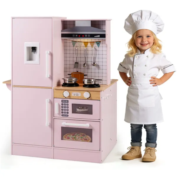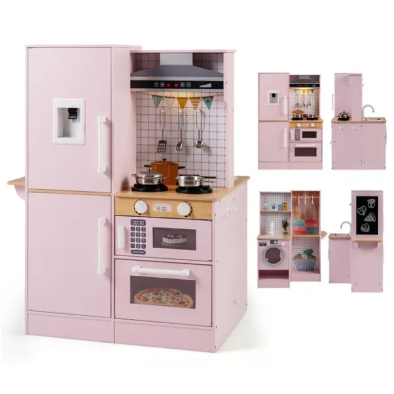 Pink Dual-Sided Kids Play Kitchen With Water Dispenser And Range Hood For 3+ Years Old