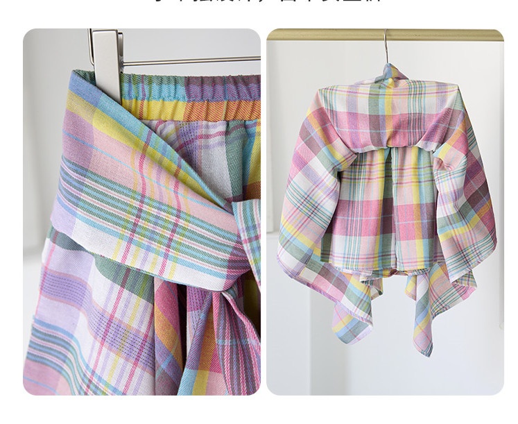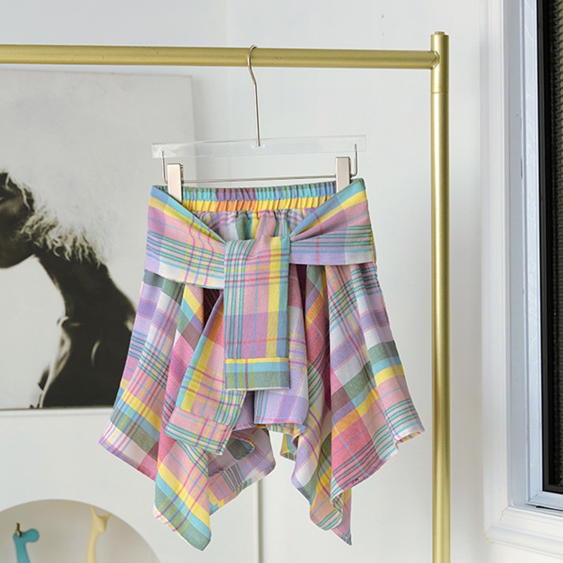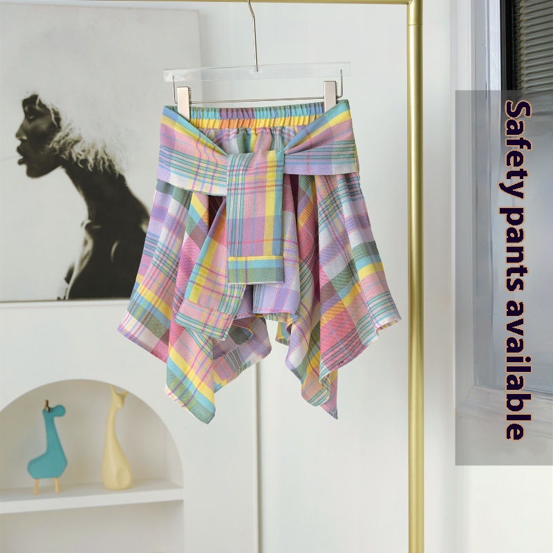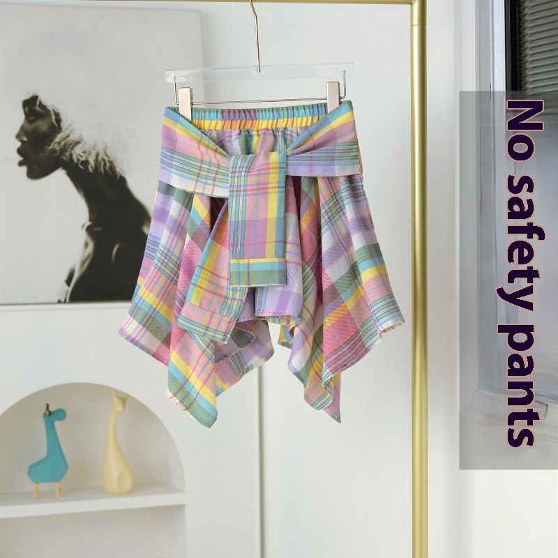 Color classification: Mori style pink plaid irregular lace up culottes (with safety pants), Mori style pink plaid irregular lace up culottes (without safety pants)