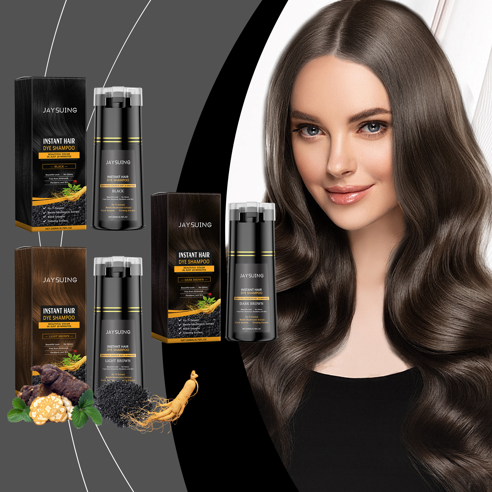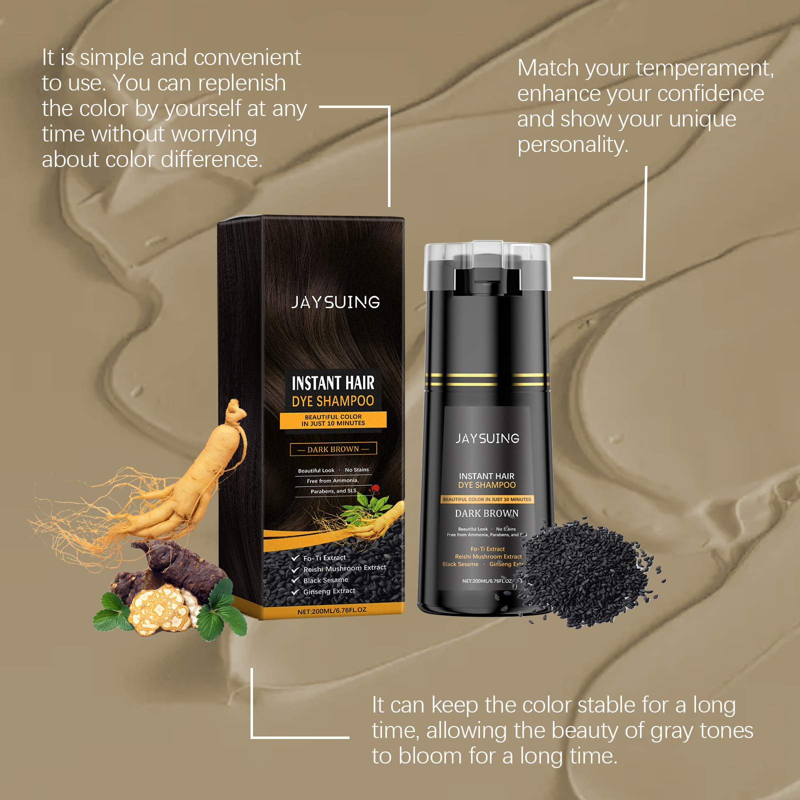 Product ingredients: water, lauryl alcohol Polyether sodium sulfate, Hydroxyethyl Cellulose, p-phenylenediamine, Methyl isothiazolinone, herbal polygon extract, Ganoderma lucidum extract, black sesame extract, ginseng extract