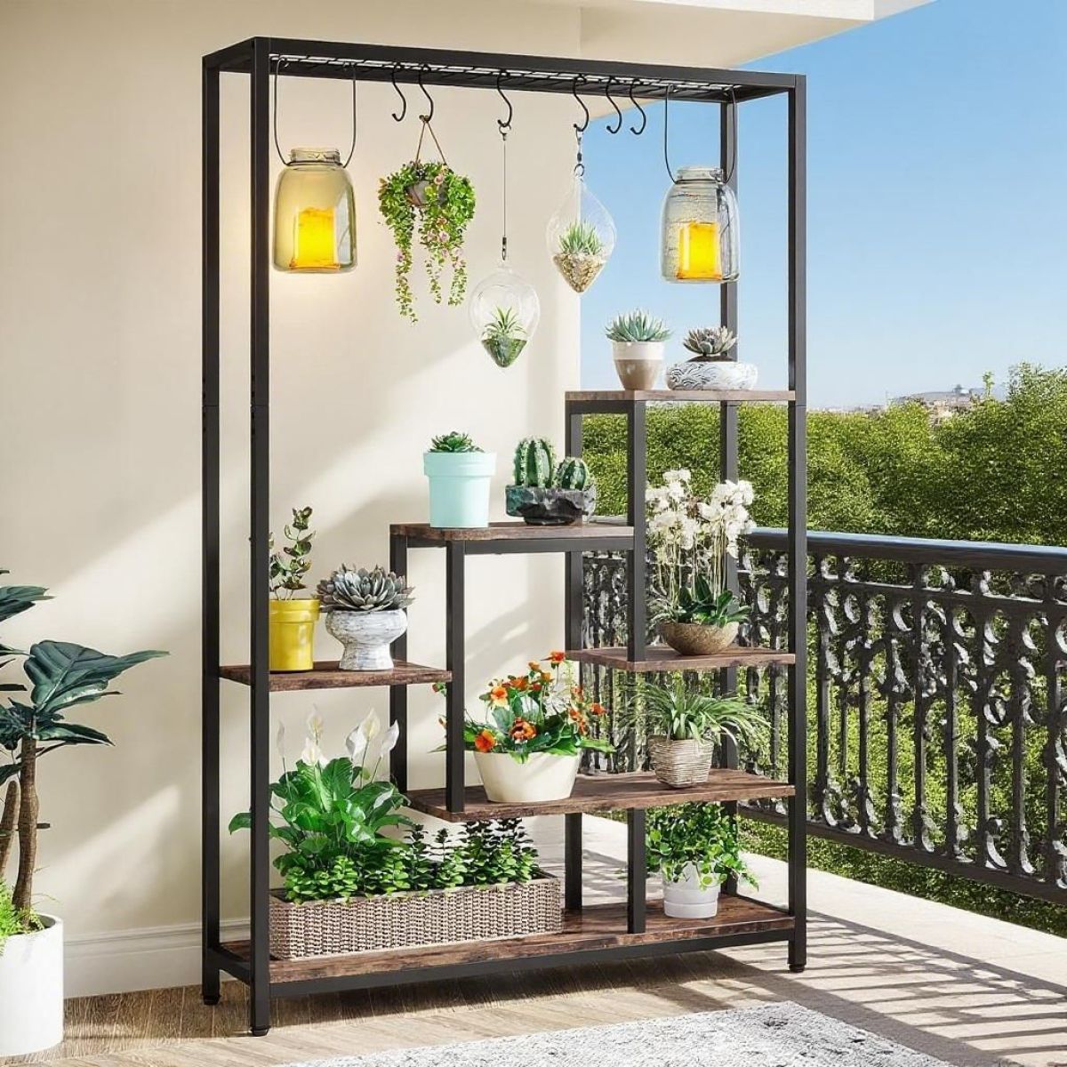 [Large Capacity for Plants]The indoor plant stand is adopted 7 shelves design and each shelf is wide and spacious enough. The metal plant shelf can hold at least more than 8 pots of regular-sized plant pots. The top wire shelf also can place small bonsai. Attached are 6 pcs S-hook is also fit for hanging display.