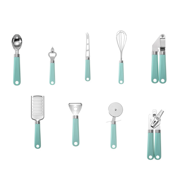 Specifications: bottle opener, ball scoop, melon cutter, cheese knife, grater, pizza wheel , egg beater, tin opener, garlic press