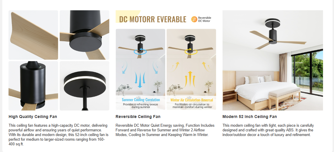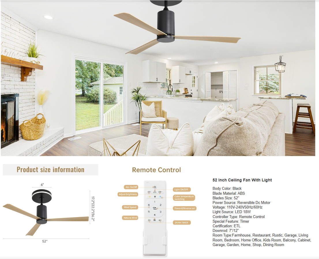 Product Name:52 Inch Modern Flush Mount Ceiling Fan with led light and Remote Control, 3 ABS Blades Noiseless Reversible DC Motor for Patio Living Room
