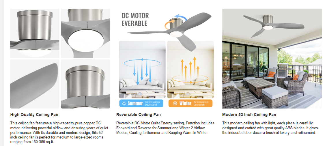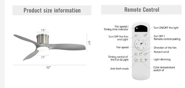 Product Name:52 Inch Flush Mount Ceiling Fan with Dimmable Led Light 3 ABS Fan Blades Reversible DC Motor For Living Room