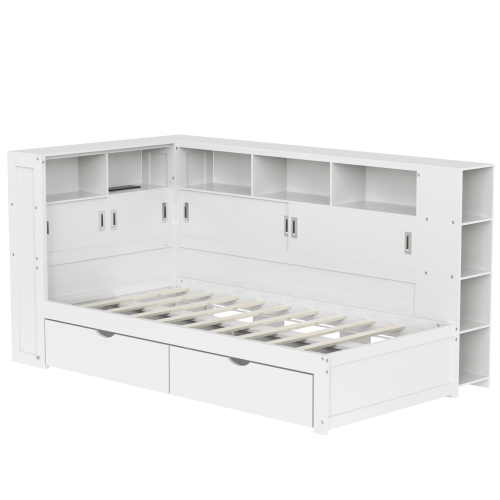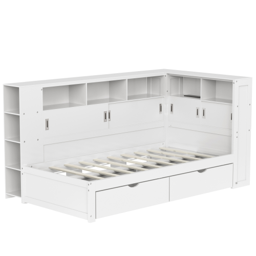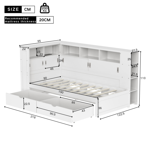 Product Name:Platform bed with trundle & bookcase & USB,Single Bed-3ft(90*190cm),Household bed, Multifunctional bed,with 2 storage drawers, dust-proof cabinet and shelves, large storage space,white
