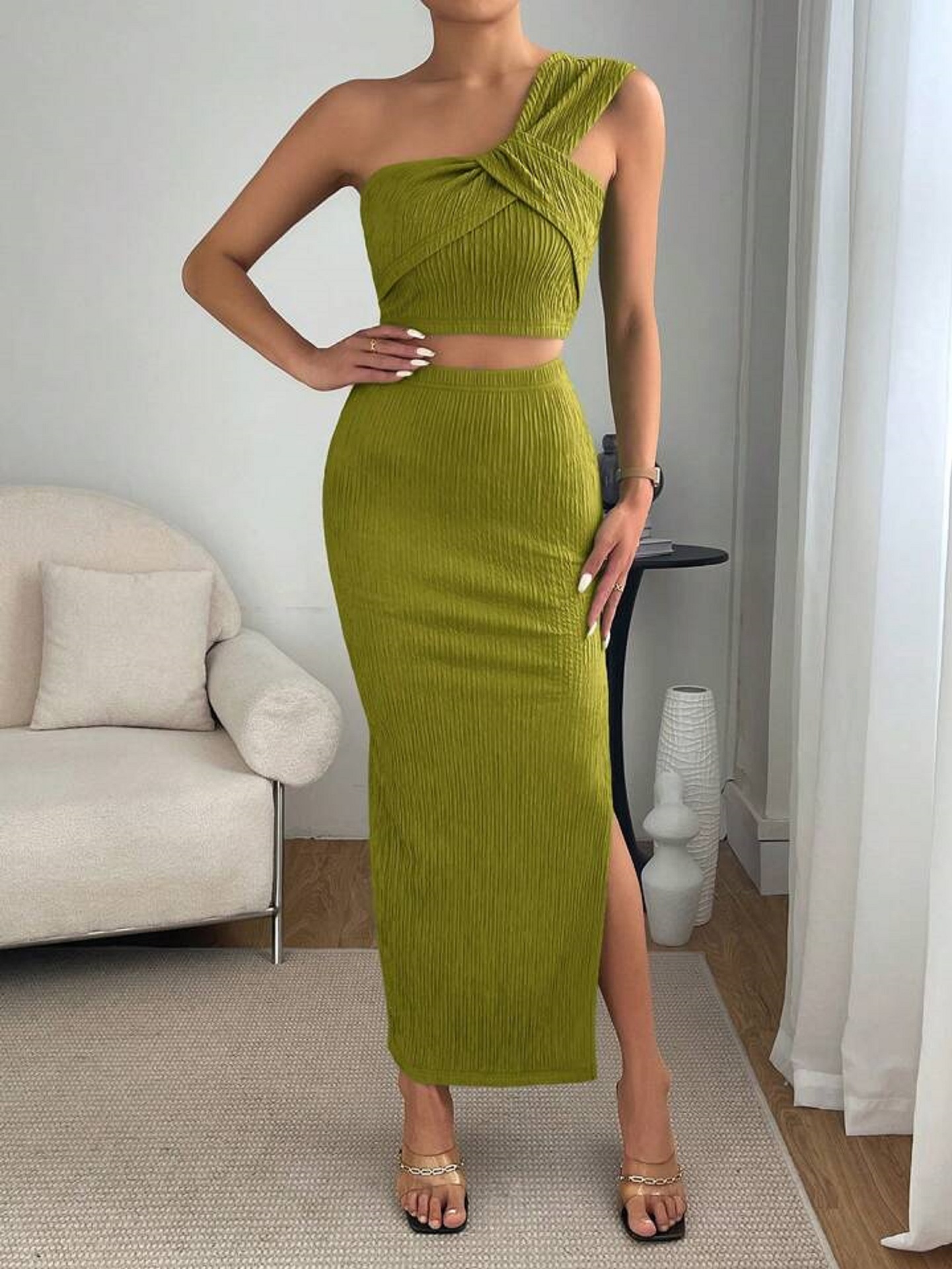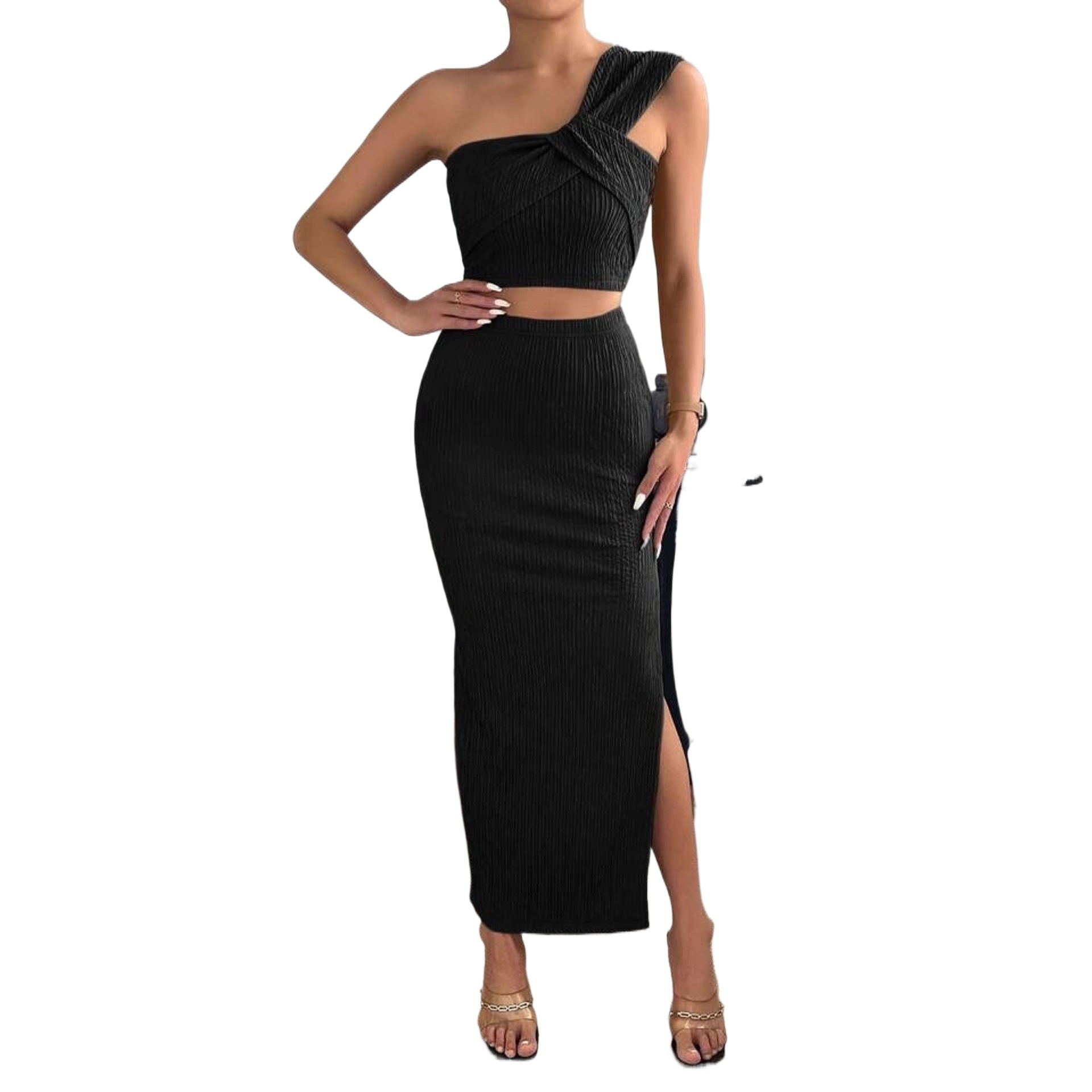 Pleated Split Skirt And Offshoulder Top Set For Summer