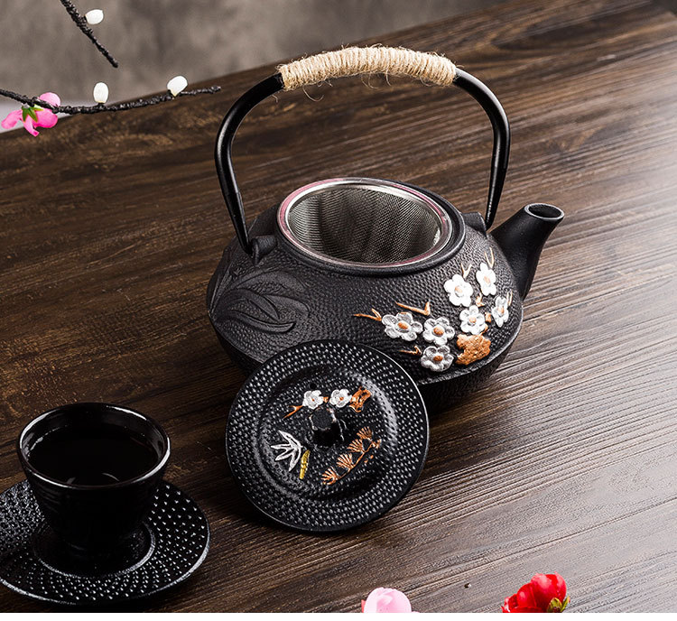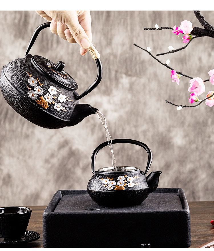 Japanese iron teapot with flower pattern.