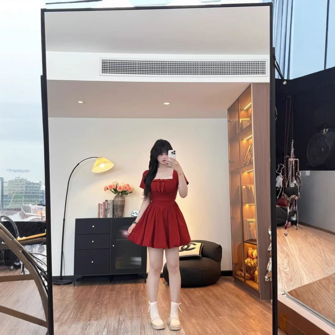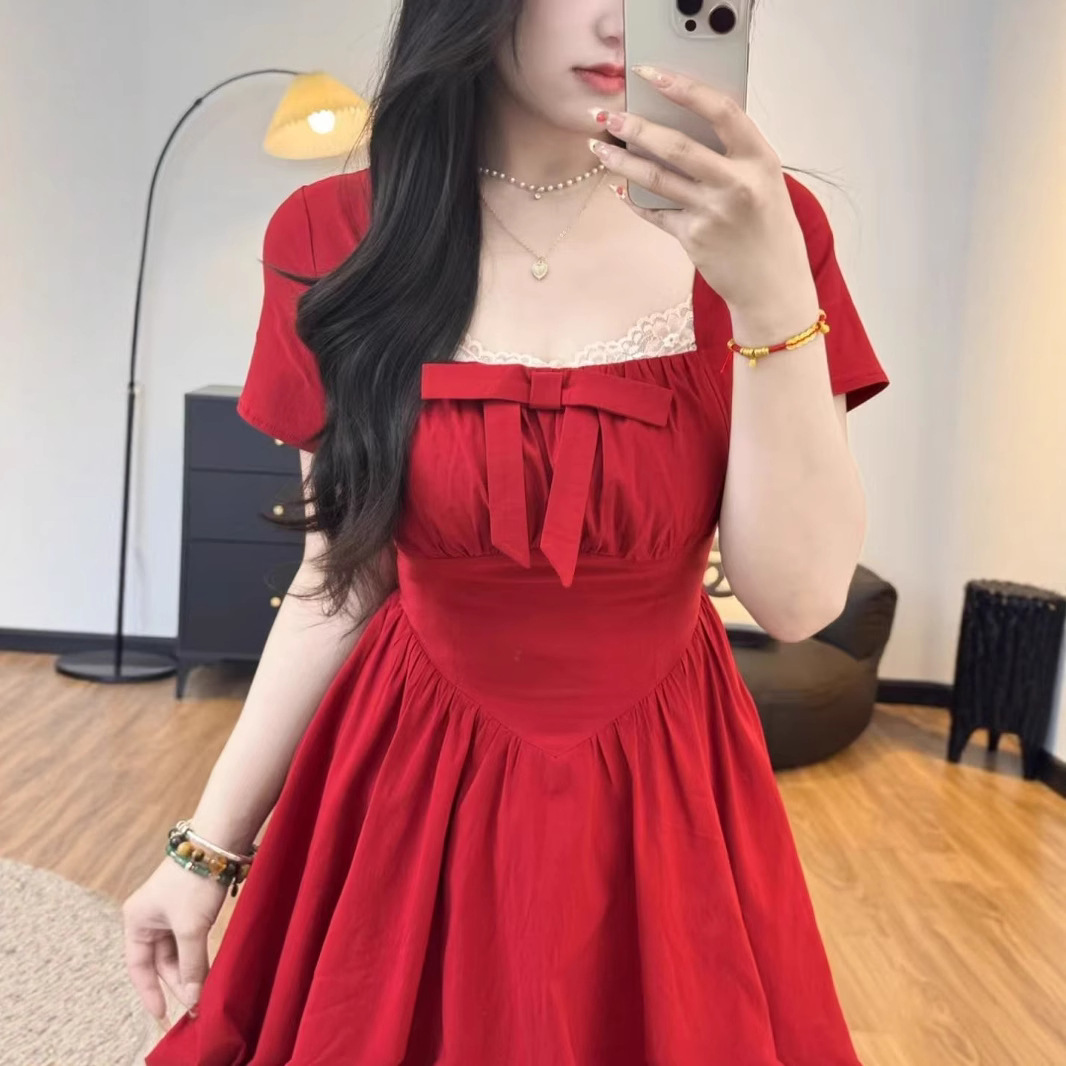 Plus-size French-style Vintage Square-neck Dress With A Bow