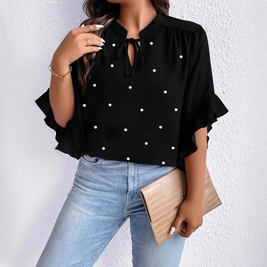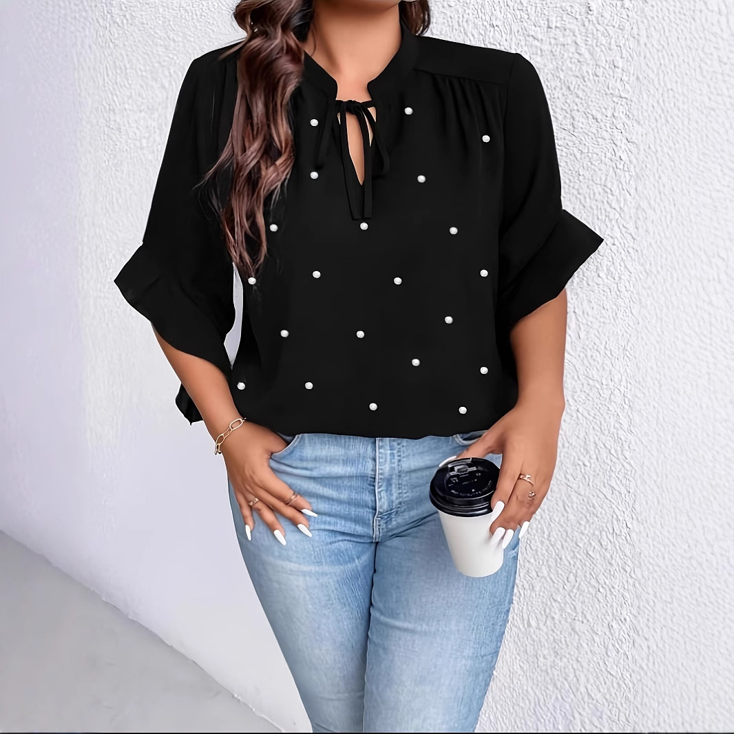 Plus Size Neckline Tie Ruffle Sleeve Faux Pearl Button Shirt