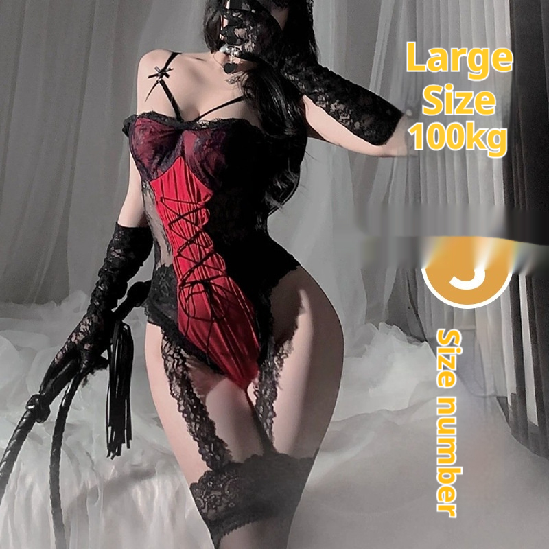 Colors: Same color as the garment, same color as the garment + matching suspender stockings, same color as the garment + matching suspender stockings + matching leather whip, same color as the garment + standard black strapless stockings