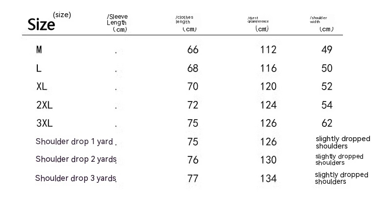 Size: M,L,XL,2XL,3XL, drop shoulder size 1, drop shoulder size 2, drop shoulder size 3