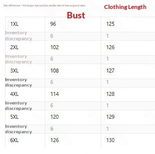 Sizes: 1XL, 2XL, 3XL, 4XL, 5XL, 6XL