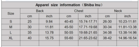 Size: S back length 25 bust 40-45, neck 26-30,M back length 30 bust 45-50, neck 30-34,L back length 35 bust 50-55, neck 34-38(7-8 kg applies), XL back length 40 bust 55-60, and neck 38-50.