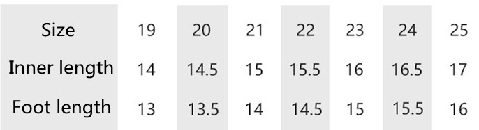 Size: Size 19 / inner length 14 cm, size 20 / 14.5 cm, size 21 / inner length 15 cm, size 22 / 15.5 cm, size 23/16 cm, size 24 / inner length 16.5 cm, size 25 / inner length 17 cm