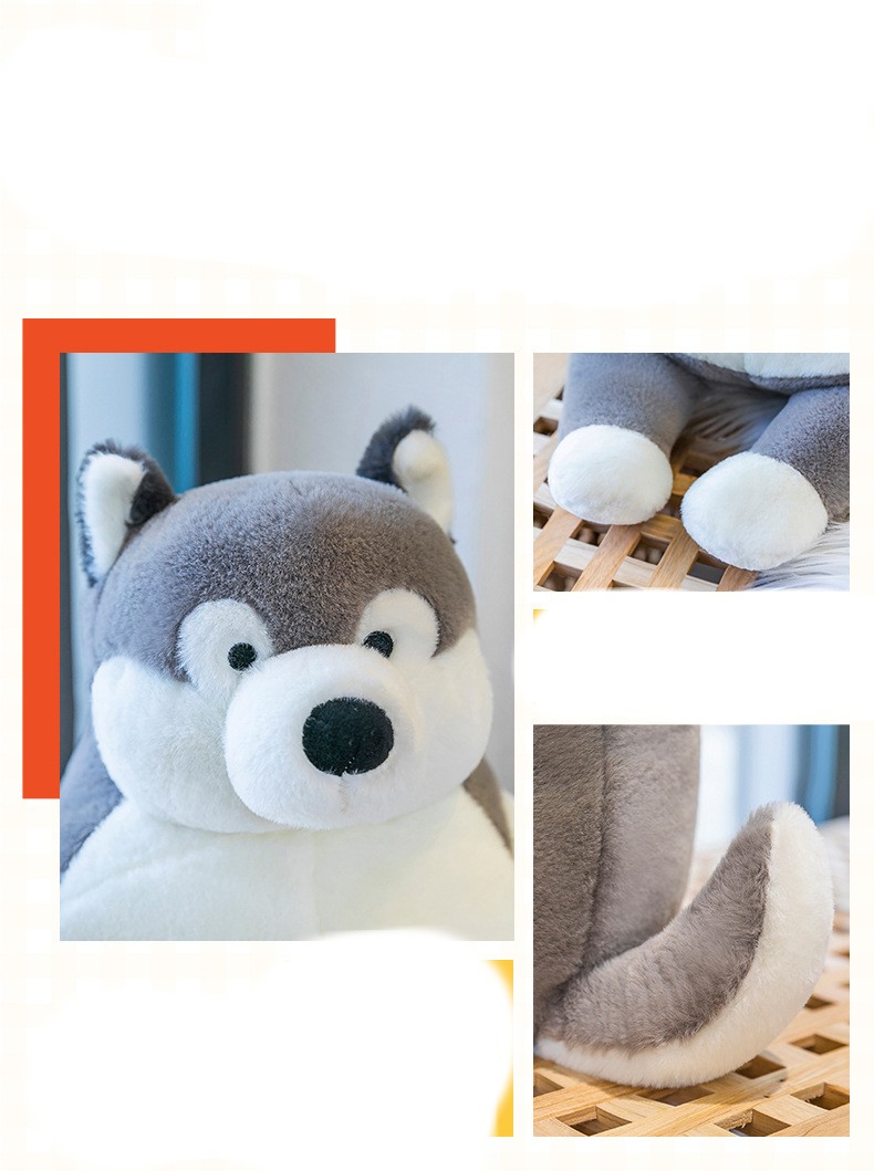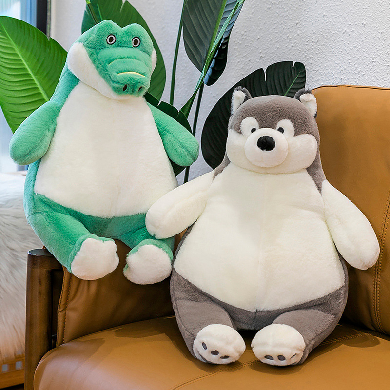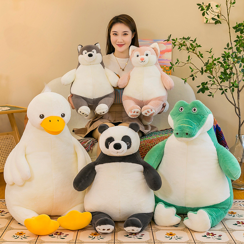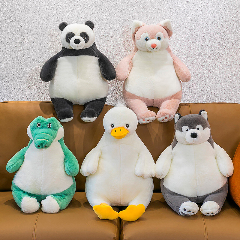 Color: white goose, green crocodile, black panda, gray husky, pink fox.