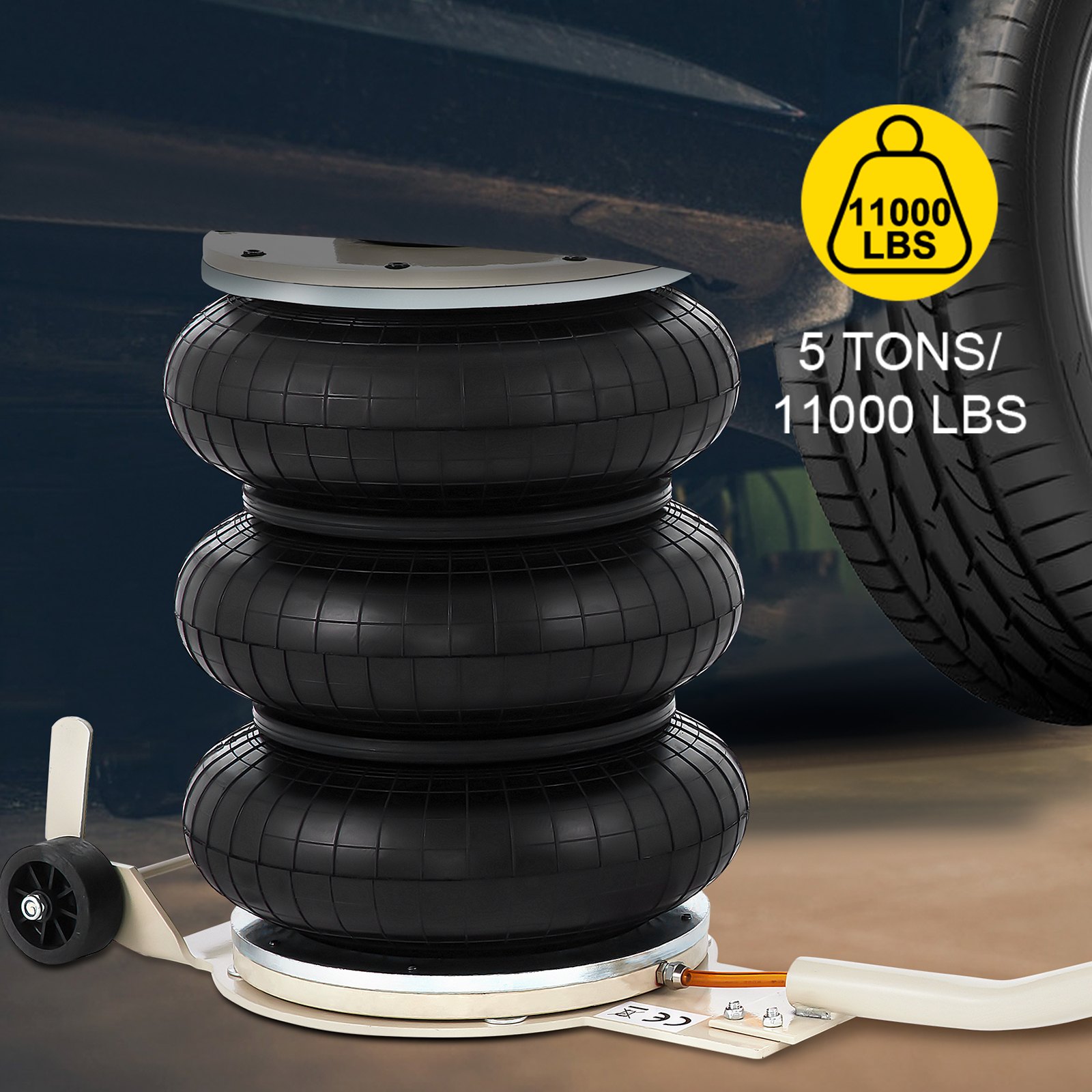 Labor-Saving Jack: The pneumatic jack capacity: 11000 lbs/5T. Minimum height: 6.3"/ 160 mm. Maximum height: 15.75"/400 mm. It only takes 5 seconds to lift. Working Temp: -60℃~ 50 ℃. Air inlet: G1/4. Our triple bag jack is the easiest and fastest way to make the car lifted.