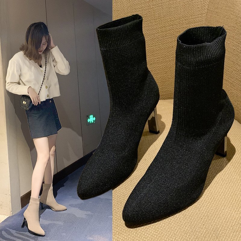 Pointed Socks Boots High Heels Elastic Boots Flat Heel Wool