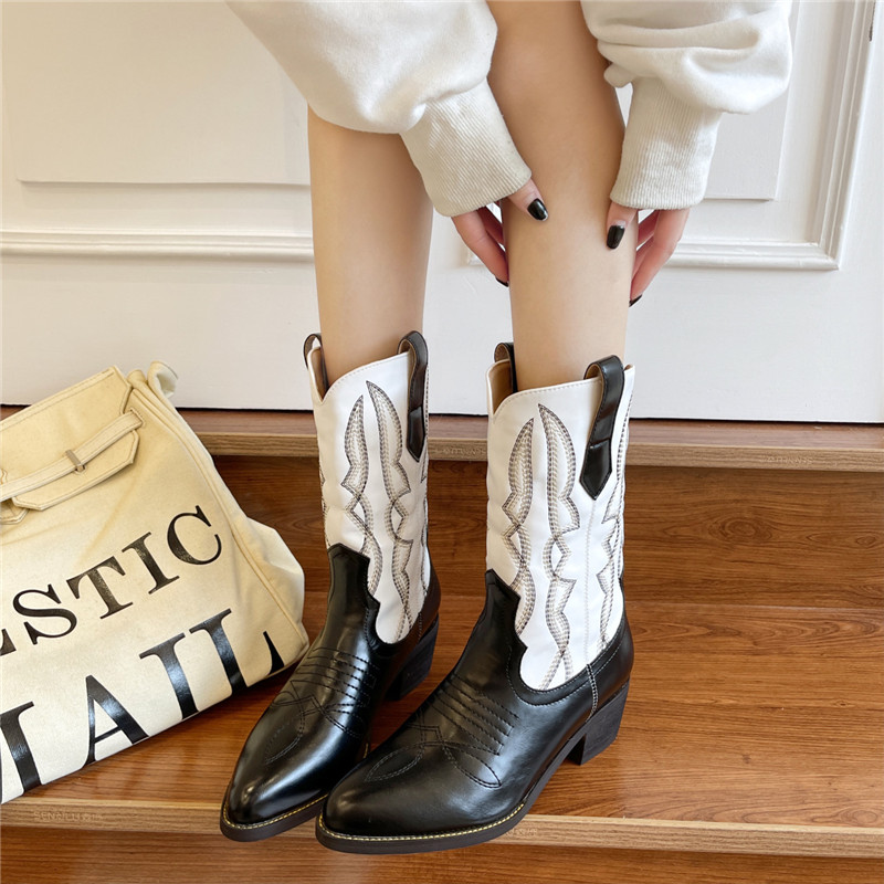 Pointed Toe Thick Heel Mid-tube Colorblock Martin Boots