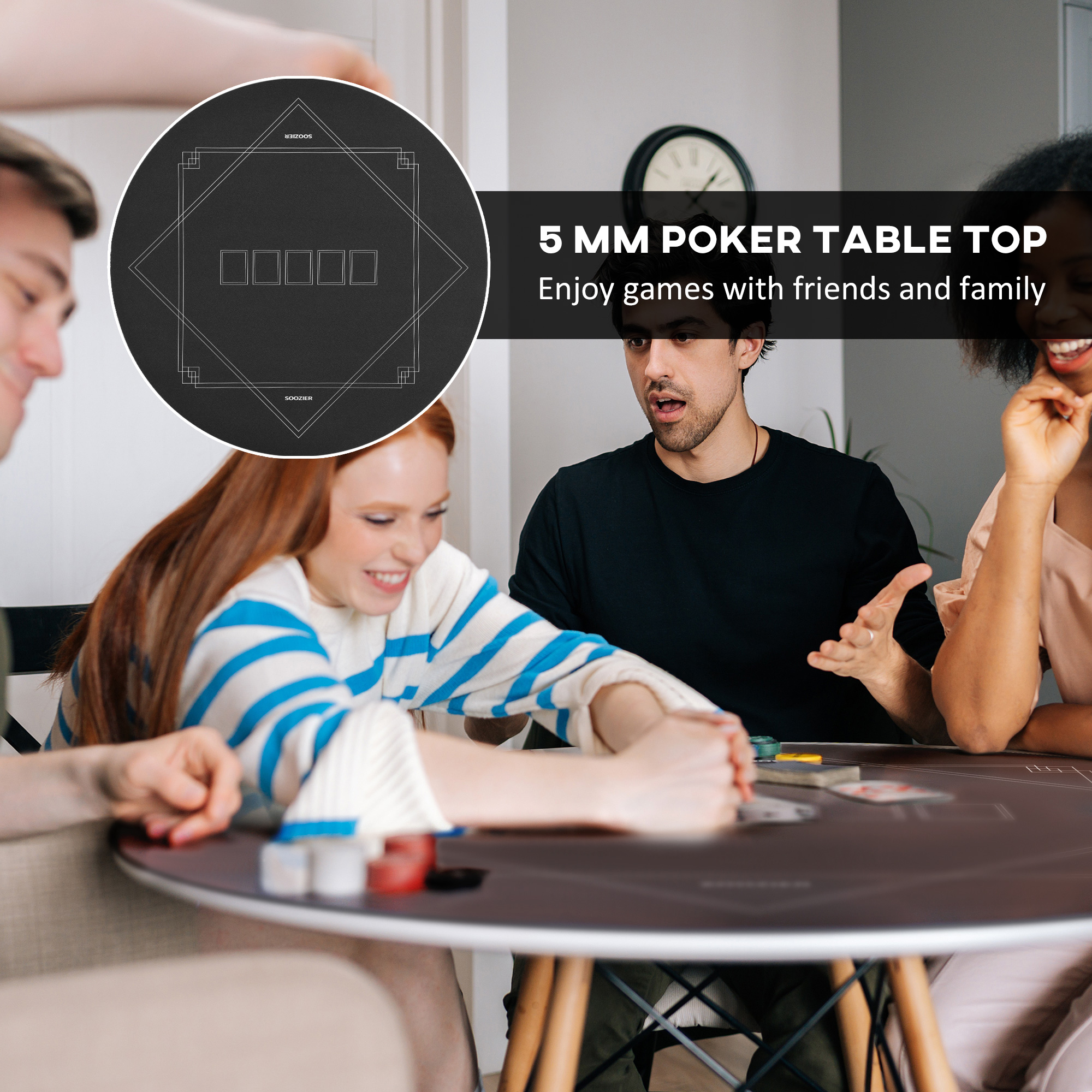 Transform any table into a poker haven with the Soozier poker mat! Designed for four players and measuring 5 mm thick, this poker table top offers comfortable and convenient use during your game time. It's crafted from wear-resistant rubber with a non-slip design for stability. Enjoy the comfort of its soft, water-resistant felt surface. Roll it up, tuck it into the carrying bag included, and take the game wherever you go!