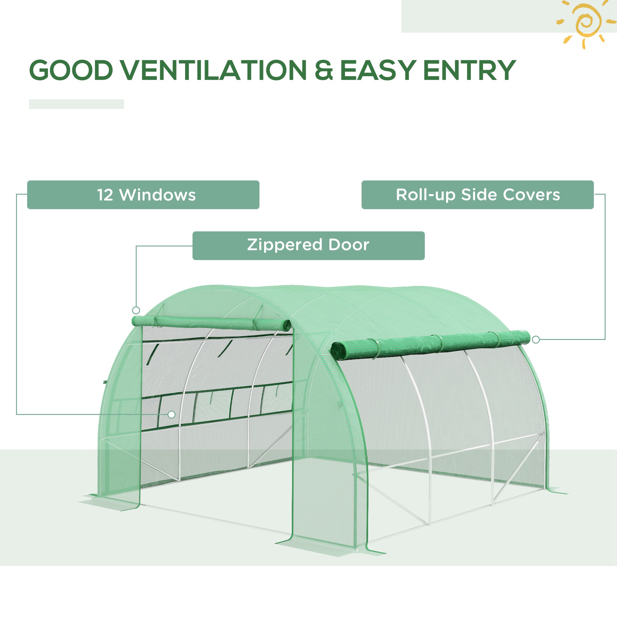 This garden polytunnel greenhouse is perfect for the home gardening enthusiast. Grow plenty of plants, vegetables and more in its open and spacious design. The galvanised steel frame means a strong standing structure, with the plastic mesh offering a safe shield for the inside. Both sides completely roll up to allow plenty of fresh air in. Complete with six roll-up windows and a large roll-up door. 4 x guy ropes and 4 x ground stakes included.